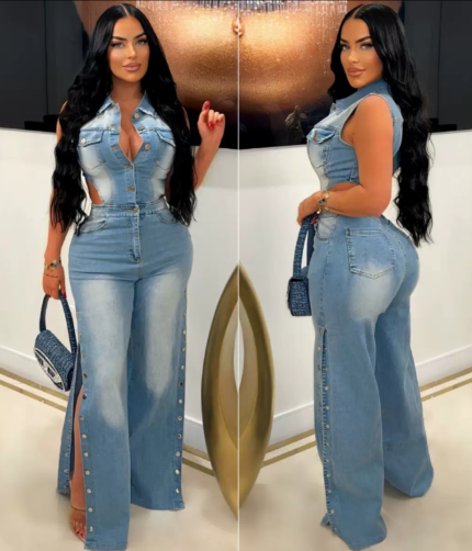 Combinaison en denim sans manches, coupe droite, avec détails modernes et style urbain chic.