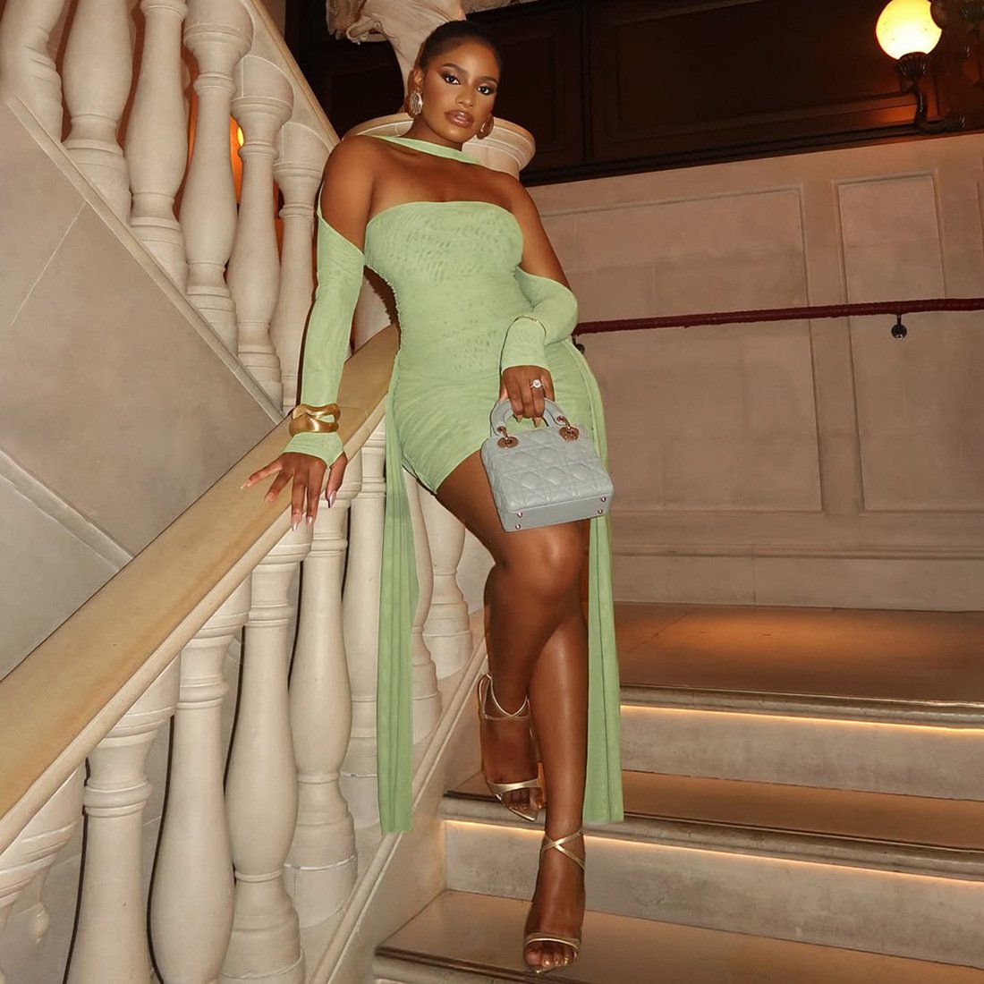 Robe ajustée en dentelle noire, manches longues, coupe glamour. Parfaite pour les soirées, rendez‑vous et événements spéciaux.