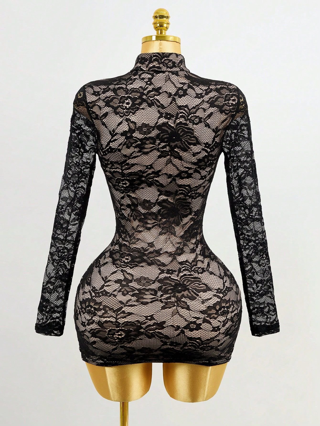 Robe ajustée en dentelle noire, manches longues, coupe glamour. Parfaite pour les soirées, rendez‑vous et événements spéciaux.