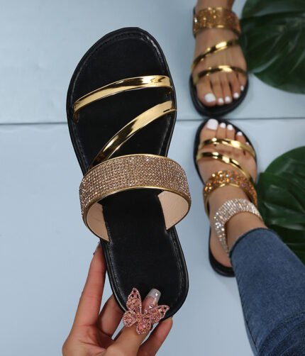 Sandales plates femme avec brides ornées de strass scintillants. Élégantes et confortables, idéales pour l’été.